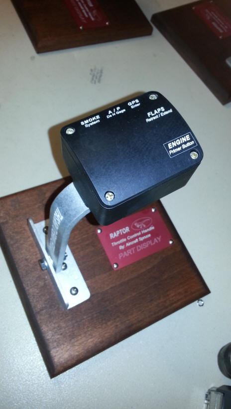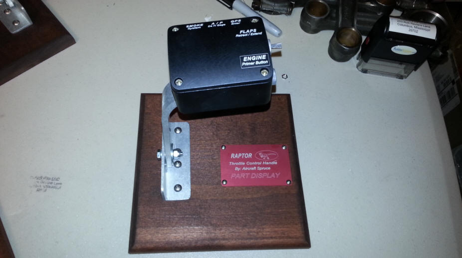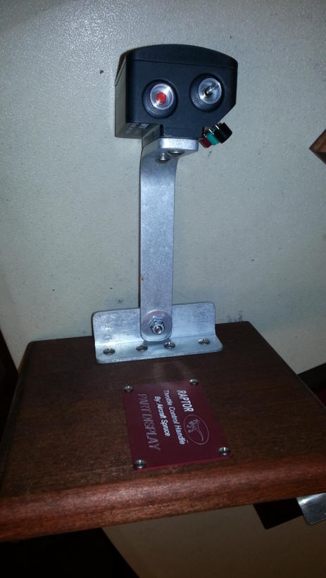 I have been looking for a Throttle Control Handle that would allow me to keep my hands on The throttle and Control grip for the majority of electrical function I may need to turn on and off. There is a new grip on the market called the "RAPTOR". Aircraft Spruce should be advertising it and selling it before July 1st of 2014. The handle. The dimensions are 1.87 inches tall. 2.9 inches wide and 2.4 inches long. It fastens with 2 10-32 threaded screw holes on the bottom of the unit.